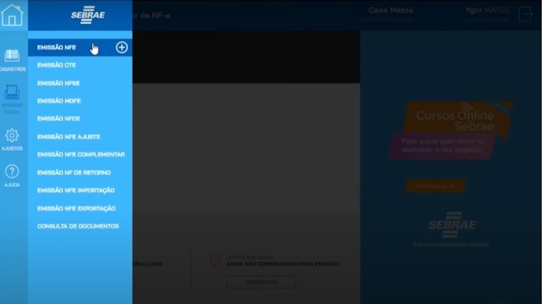 - Após realizar esses passos, você já pode emitir a sua nota fiscal. O processo é simples, basta clicar no menu à esquerda e escolher o tipo de nota fiscal.