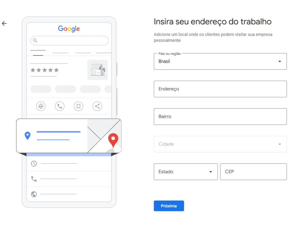 O Google Meu Negócio também vai precisar de seu endereço correto. Este endereço pode ser sua casa, se você ainda não possui espaço físico para sua loja. No entanto, se possui um espaço específico, pode escolher esse endereço. De qualquer forma, é muito importante colocar a cidade, estado e CEP corretamente. Assim, você vai aparecer na pesquisa local.