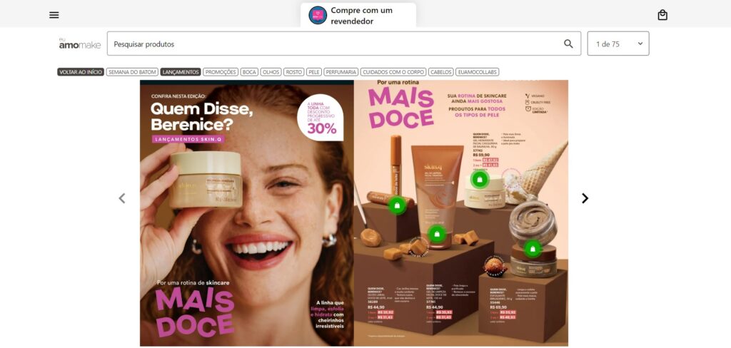 - Familiarize-se com o Catálogo “Eu Amo Make”: Este catálogo inclui não só os produtos da Quem Disse, Berenice?, mas também as marcas Intense e Make B. Dessa forma, dedique tempo para entender a gama completa de produtos disponíveis. Isso inclui maquiagem, perfumaria, skincare, produtos para o corpo e cabelos. Ter um bom entendimento de cada categoria permitirá que você faça recomendações informadas e adaptadas às necessidades das suas clientes.